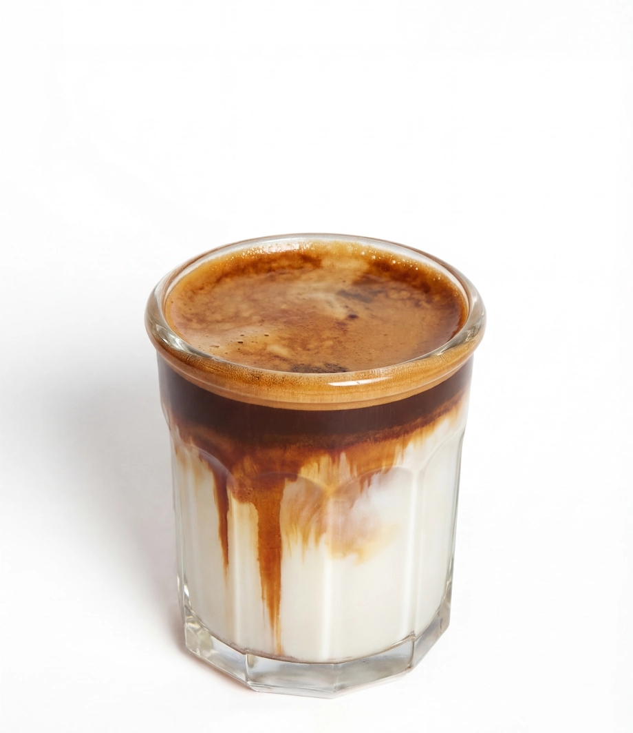 – With a teaspoon — place a spoon just above the milk surface and pour the espresso over it to slow the flow and control layering.